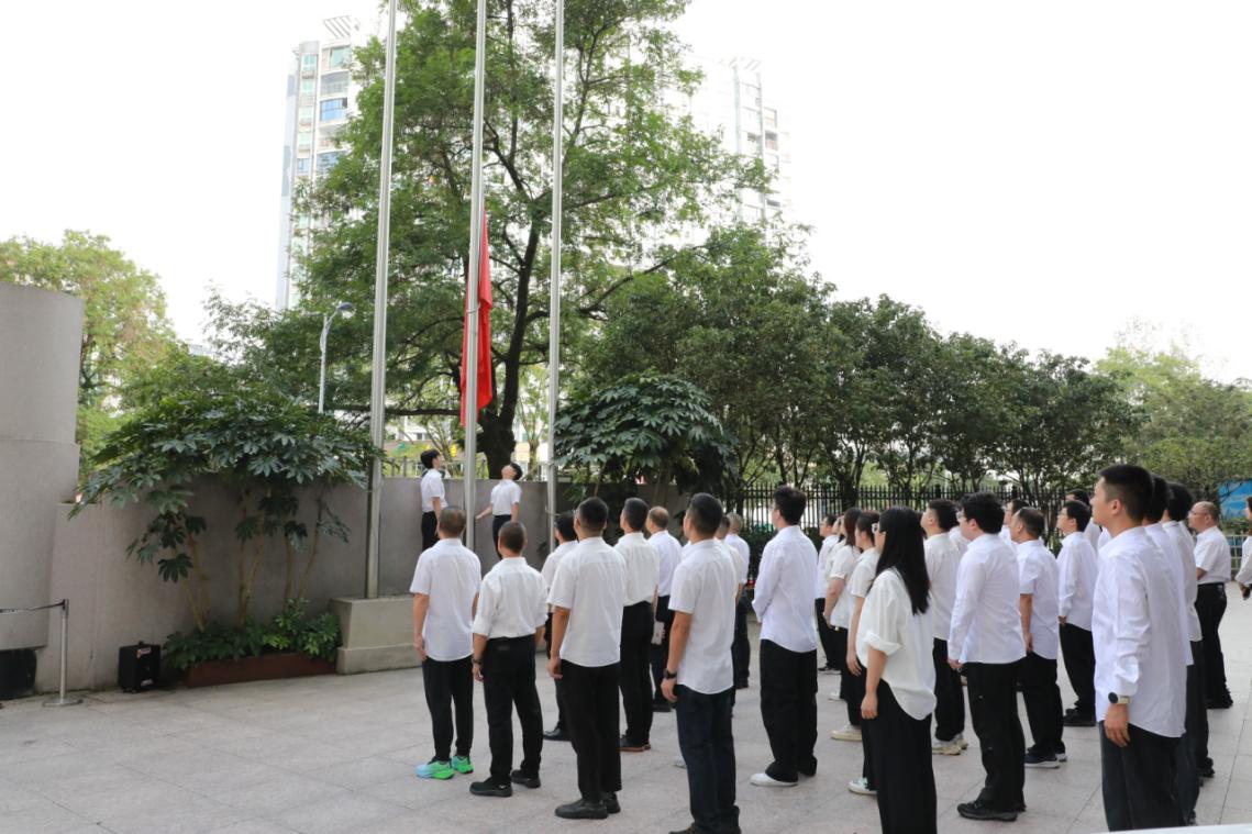 上午八点整,升旗仪式正式开始。两名着装整齐的护旗手迈着矫健的步伐护送五星红旗入场,全体人员统一着装、整齐列队,庄严肃立。伴随着雄壮激昂的《义勇军进行曲》,鲜艳的五星红旗缓缓升起,全体在场人员面向国旗行注目礼,向伟大祖国致以崇高敬意与美好祝福。