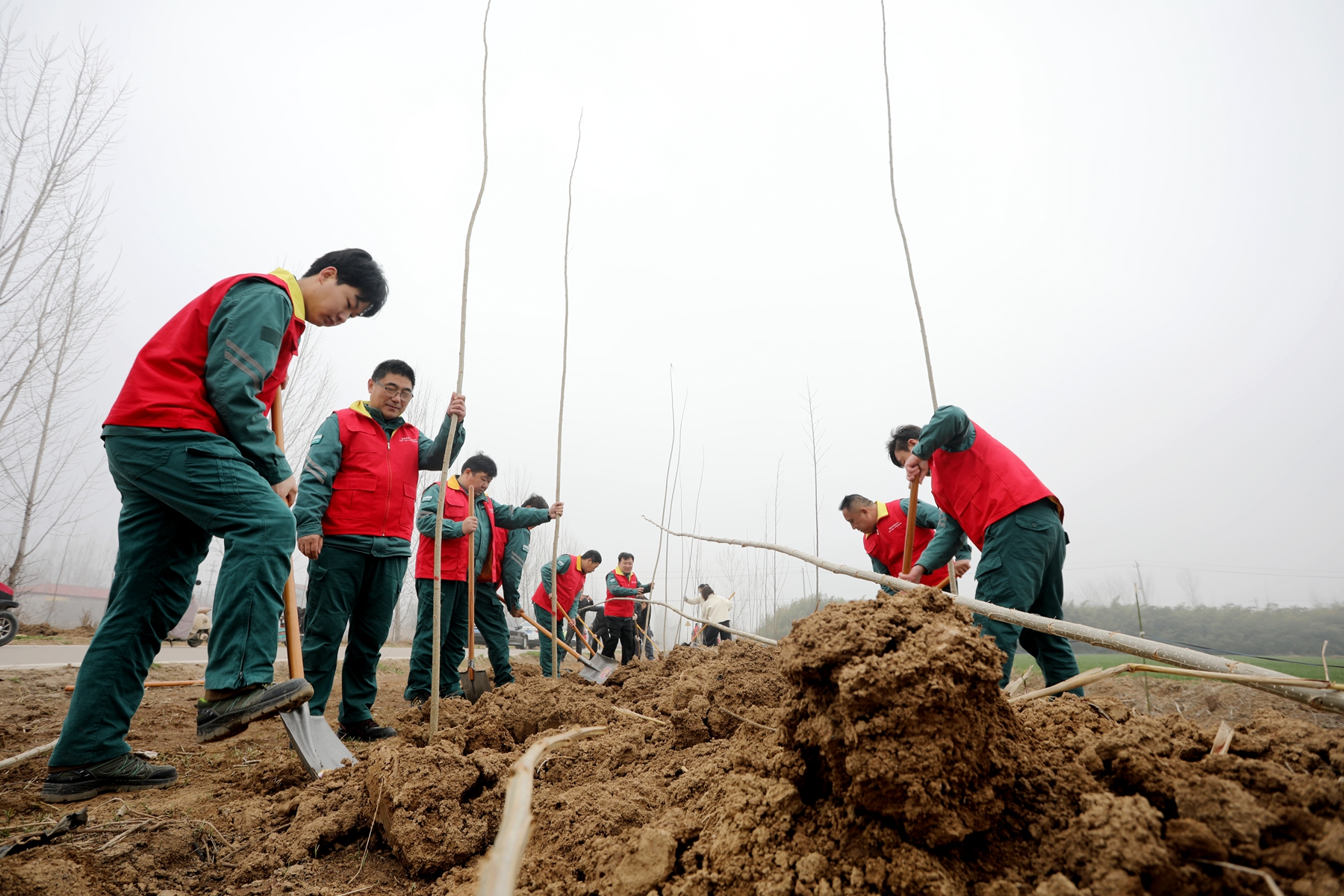 春风催新绿,植树正当时。梁山公司服务队员携带铁锹等工具奔赴植树现场,人人精神抖擞、干劲十足,大家分工协作、默契配合,有的扶苗定根,有的俯身培土压实……每个环节都衔接有序。在大家团结协作下,近三十株新栽树苗整齐排列、迎风挺立,为原本空旷的土地披上了新绿。