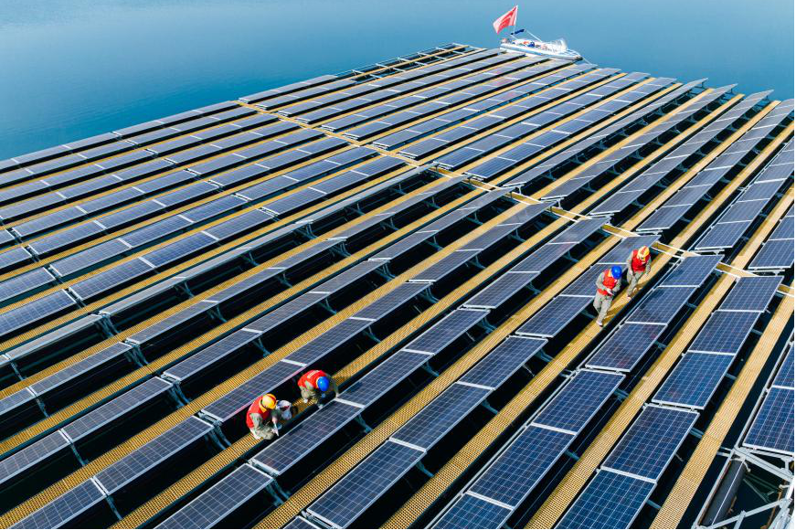 国网荆门供电公司员工在水光互补分布式光伏电站开展运维巡视。