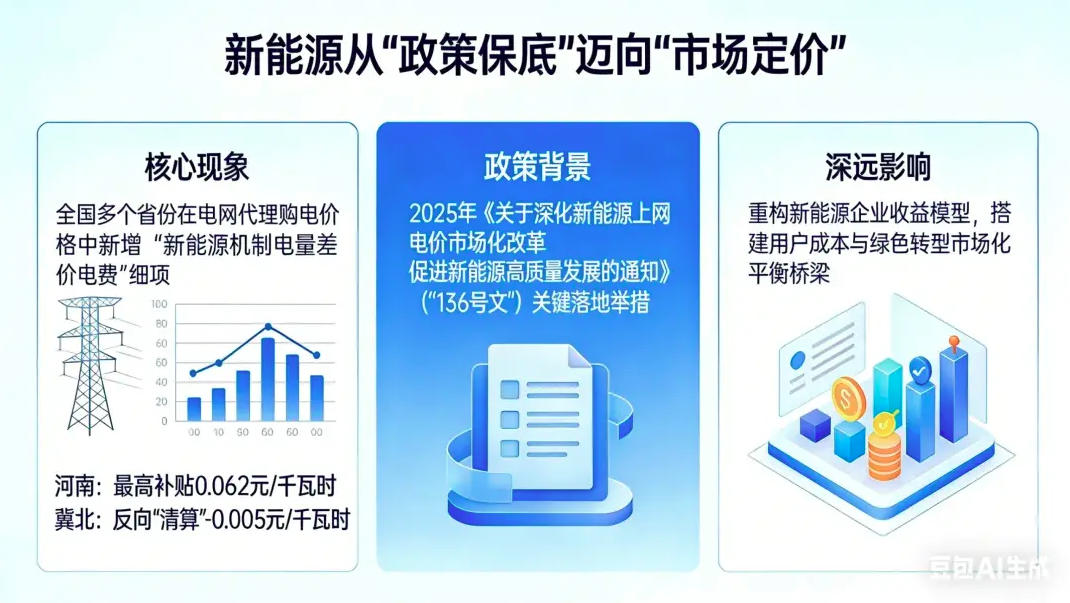 2026年伊始,全国多个省份在电网代理购电价格公示中,齐刷刷新增了“新能源机制电量差价电费”这一细项。从河南0.062元/千瓦时的最高补贴,到冀北-0.005元/千瓦时的反向“清算”,这场覆盖全国主要用电区域的价格机制调整,如同一张精准的“价格地图”,勾勒出我国新能源从“政策保底”全面迈向“市场定价”的转型轨迹。作为2025年《关于深化新能源上网电价市场化改革 促进新能源高质量发展的通知》(以下简称“136号文”)的关键落地举措,差价电费的登场,不仅重构了新能源企业的收益模型,更在用户成本与绿色转型之间搭建起市场化的平衡桥梁。