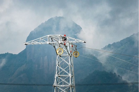 国网浙江衢州供电公司施工人员在国网新源浙江衢江抽水蓄能电站500千伏送出工程现场架线。