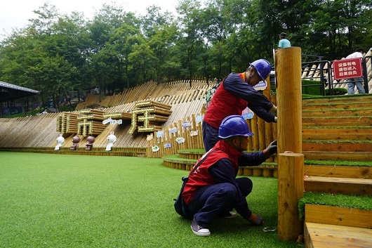 国家电网辽宁电力(本溪)雷锋共产党员服务队队员帮助“小市一庄”景区检查新安装的灯光设备。