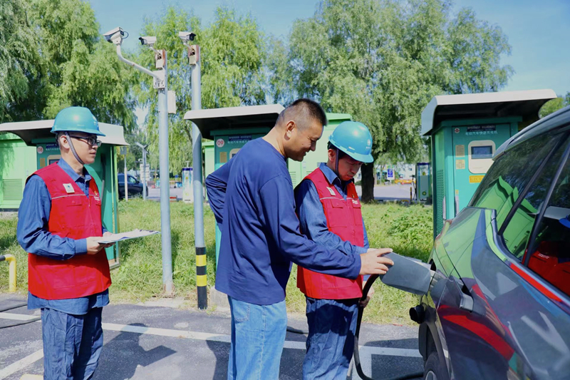 国家电网首都电力(朝阳)共产党员服务队队员指导车主充电。