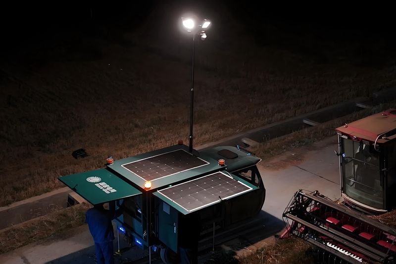 10月17日晚,在安徽省凤阳县小岗村村西种粮大户程夕兵家的稻田里,一台源储充一体保电作业车亮起LED灯柱,20多米范围的田间瞬间亮了起来。在灯光照耀下,两台收割机趁着雨歇间隙启动作业,金黄的稻穗随着机器轰鸣不断卷入机身。