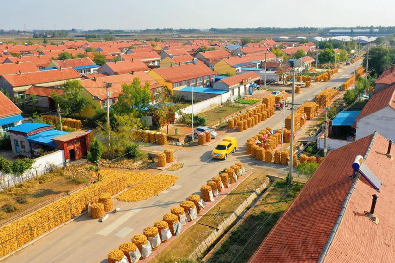 10月25日,在河北石家庄市行唐县翟营乡高标准农田项目区一望无际的玉米田里,两台联合收割机开足马力驰骋,伴随着轰鸣声,一排排挺拔的玉米秆被卷入机械“腹中”,顷刻间流出金黄的玉米粒。