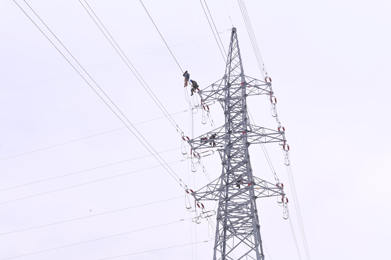 国网湖北电力员工开展500千伏蒲咸一二回线抗冰改造。