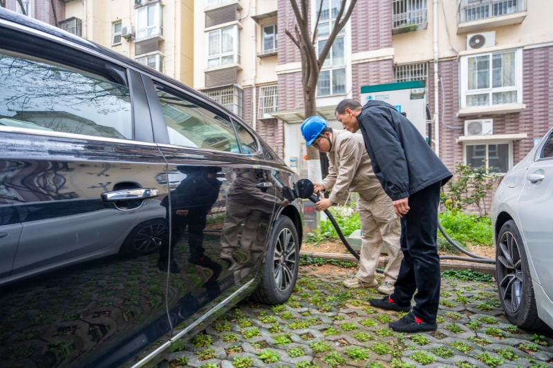 国网江苏南京供电公司员工在老旧小区协助新能源汽车车主充电。