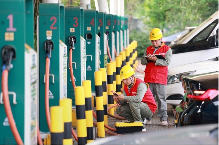 国网湖南湘潭供电公司员工在昭山服务区新能源汽车充电站开展巡检,排查充电设备安全隐患。
