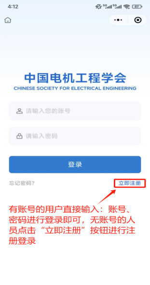 3.如没有学会账号点击注册,如有学会账号直接登录。完成会议系统用户注册。