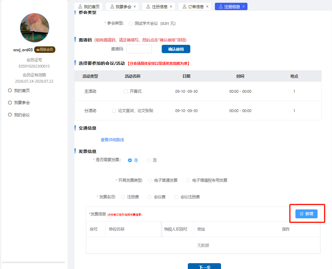 5.核对并填写会议注册信息点击下一步(参会类型为必选项,发票信息选择“是”即可进行填写发票信息)。