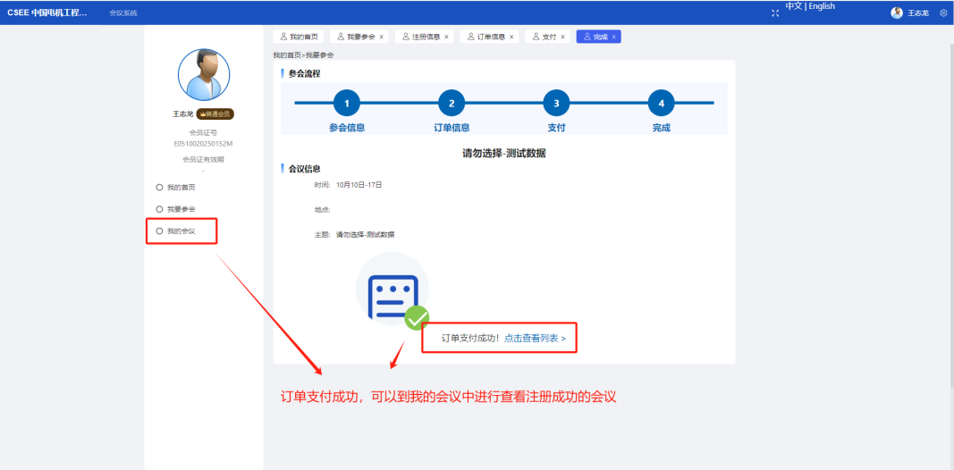 8.跳转到订单支付成功页面,说明完成了会议注册(可以在我的会议中查看所有注册的会议)。