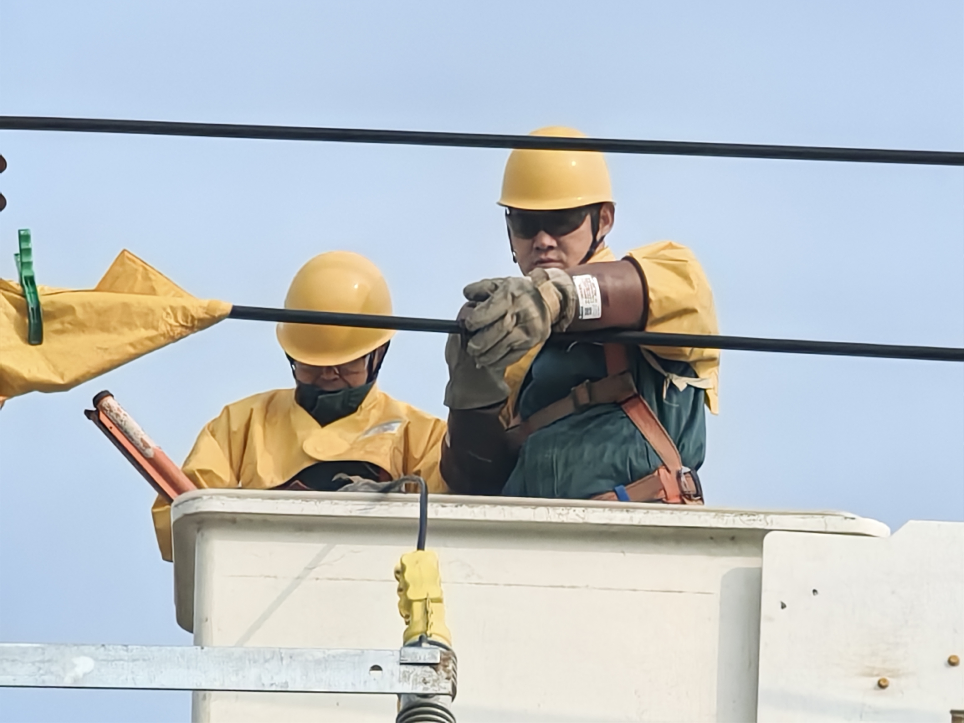 当天8时30分,作业人员来到公明东I线65+1号杆工作现场,按照标准化流程布置安全措施,悬挂“止步,高压危险”和“在此工作”的警示标识牌,一切准备就绪后,两名全副武装作业人员登上绝缘斗臂车,稳稳升至十余米高的作业位置,两人互相配合精准验电、严密遮蔽、稳固安装、精准接火……“注意与带电体保持安全距离!”“遮蔽毯边缘压实!”工作负责人和监护人始终保持高度警惕,认真观察高空作业人员的每一个细微动作,不放过任何潜在风险,时刻提醒作业人员注意安全。