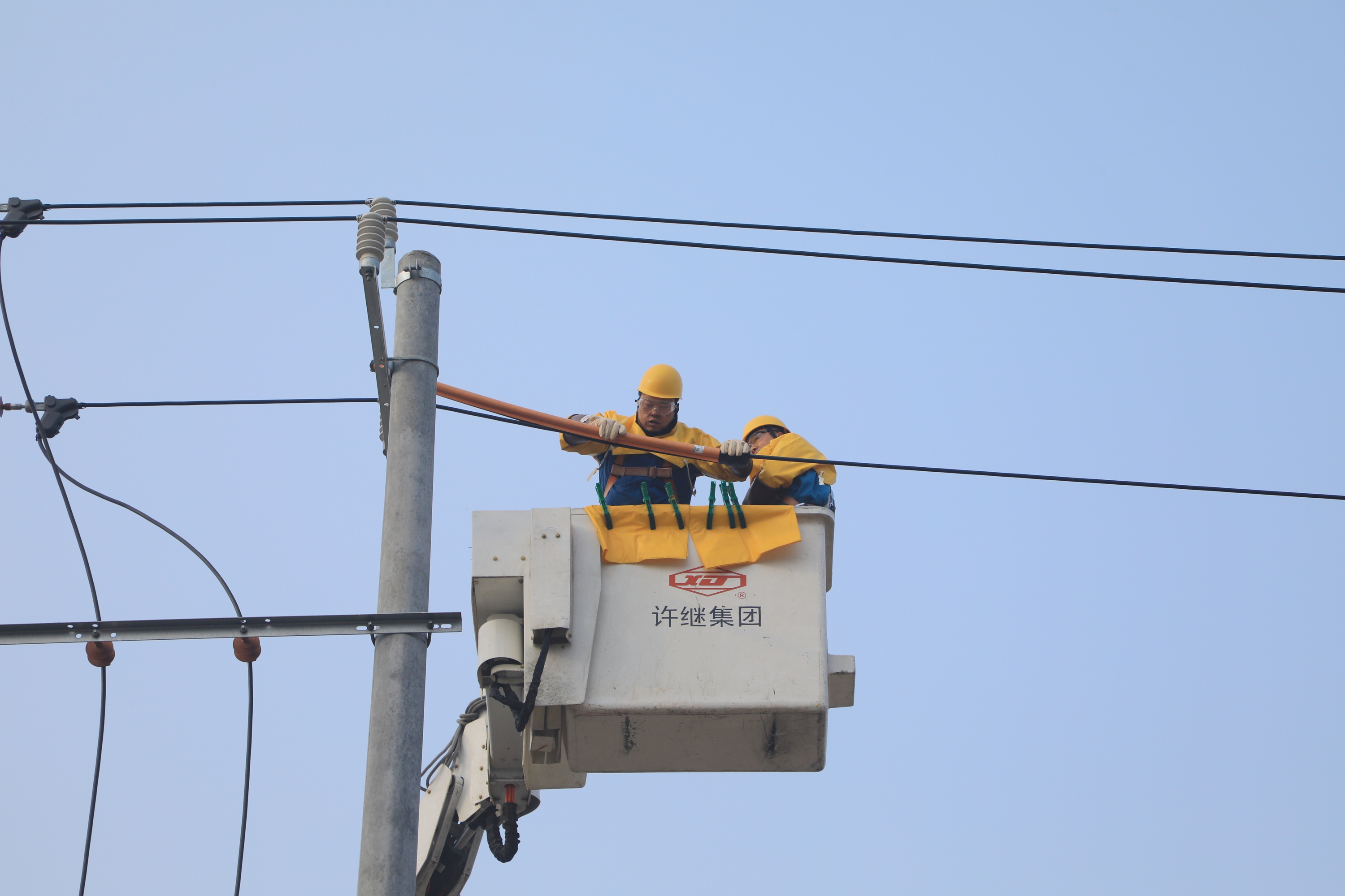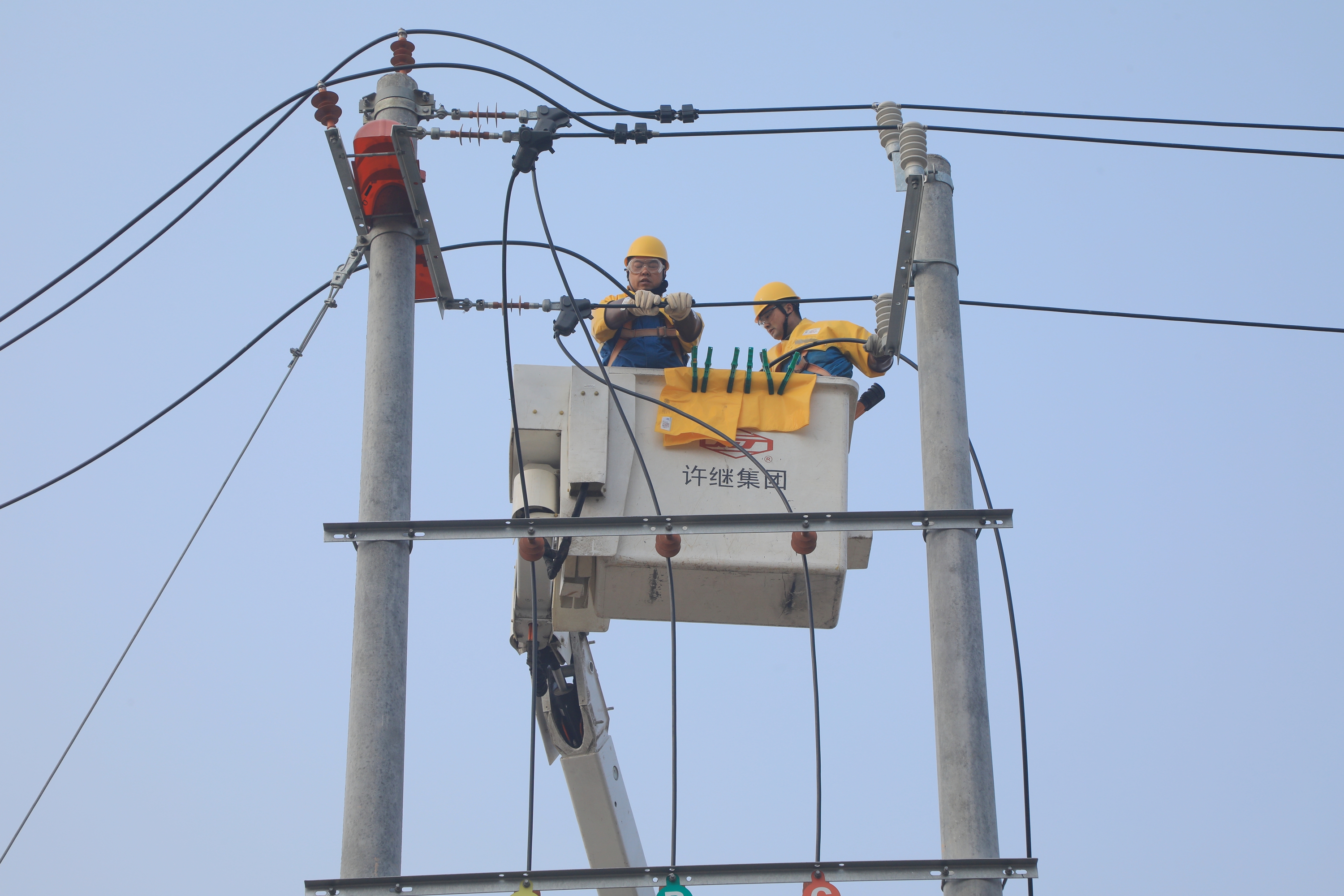 为最大限度减少对同一线路上其他企业客户的用电影响,该公司采取“零感知”的带电作业方式完成新建台架变压器接火。当天9时许,一辆橘黄色的绝缘斗臂车缓缓驶入工作现场,稳稳地停在指定位置,作业人员迅速行动起来,严格按照操作规程,有条不紊地摆放安全围栏、悬挂警示标识,仔细检查绝缘工具等,做好一切安全措施后。在工作负责人的监护下,两名作业人员身着厚重黄色绝缘披肩、头戴安全帽、手戴三层防护手套,迅速登上绝缘斗臂车。随着绝缘斗臂缓缓抬起,将作业人员平稳送达十余米高空,展开绝缘遮蔽、搭接引线等工作。整个带电接引过程如“穿针引线”般精准流畅,仅用30分钟顺利完成工作任务。