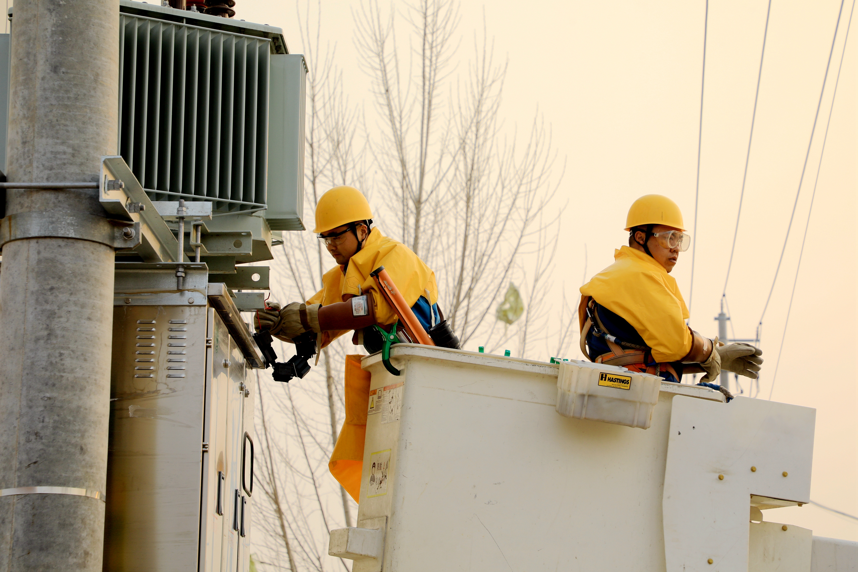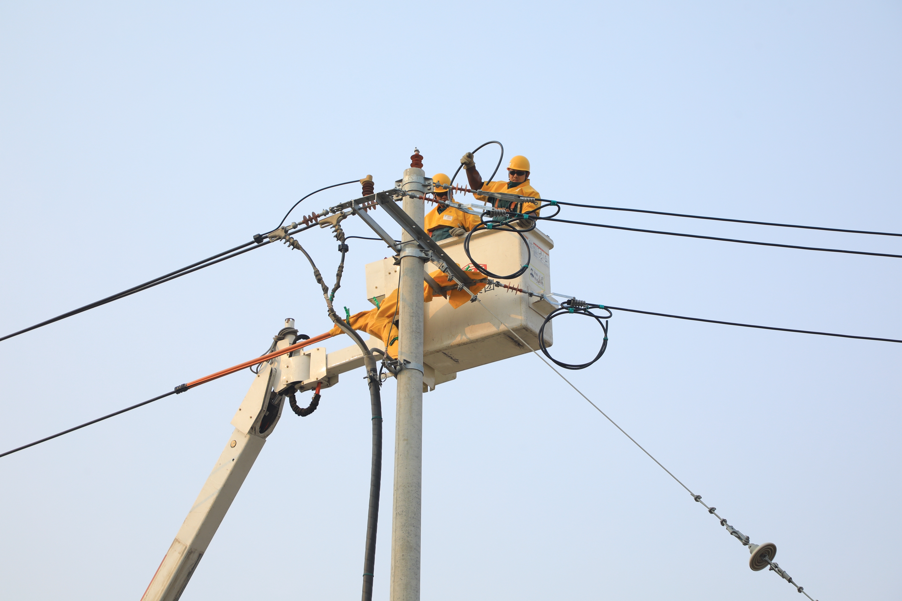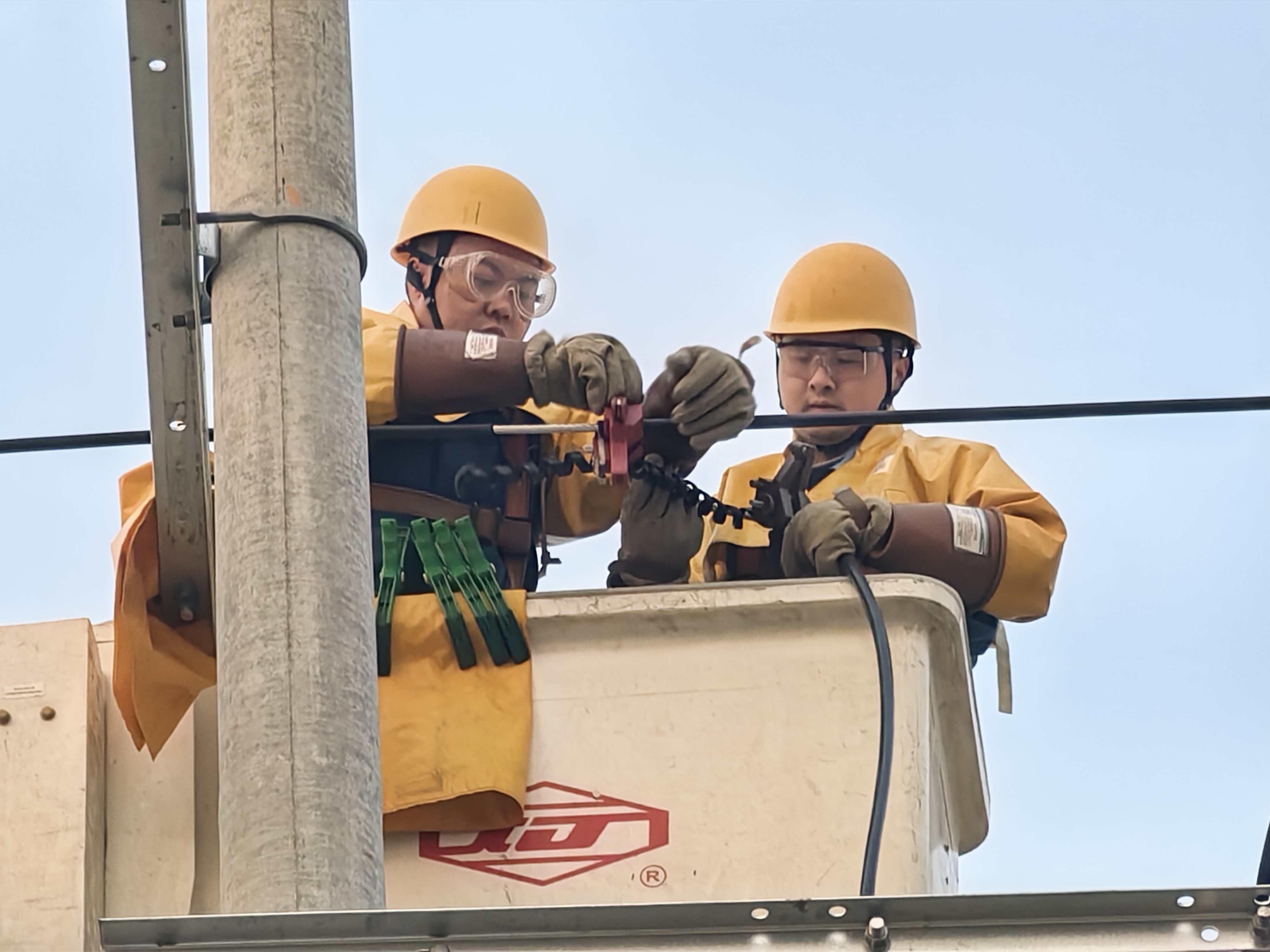 为确保新装变压器按时投运且不影响其他客户正常用电,梁山公司采取带电作业方式进行接火送电。当天14时许,带电作业人员到达工作现场,在工作负责人的监护下,两名全副武装的作业人员登上绝缘斗车升空作业,严格执行标准化作业流程,验电、绝缘遮蔽、剥切导线、搭接引线……每一个环节都严谨细致。经过近3个小时的连续奋战,作业人员相继完成10千伏馆里北Ⅰ线114号杆、马营Ⅱ线19号杆、马营线中稀天马分支46号杆三处作业点的新装变压器引线搭接,满足小微企业生产用电需求。