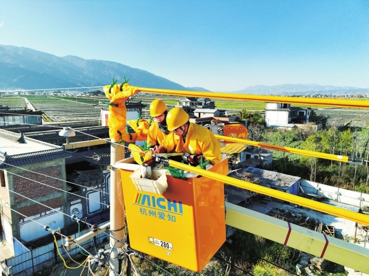 大理供电局带电作业中心工作人员在云南大理喜洲镇河矣江村开展带电作业。 周志旺 摄