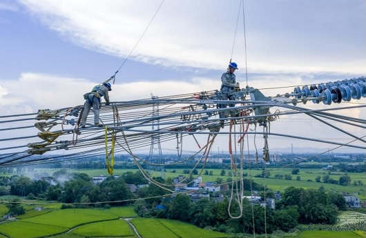 近日,甘肃至浙江±800千伏特高压直流输电工程安徽段进入架线施工阶段。图为在安徽省芜湖市南陵县,安徽送变电工程有限公司施工人员在高空进行架线施工。