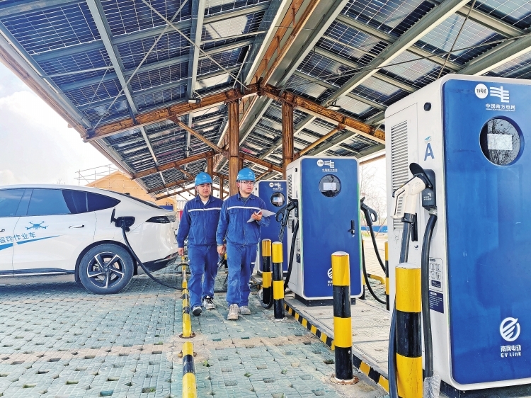 在广西南宁市宾阳县古辣镇稻花香里综合能源站,巡检人员检查充电设施运行情况。 陈凤彪 摄