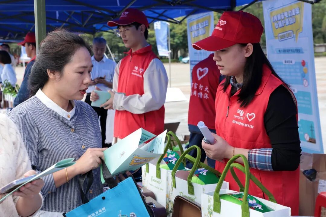 南方电网海南儋州供电局青年志愿者为市民发放、讲解《海南省电力建设与保护条例(修订)》宣传册。(王涵璐摄)