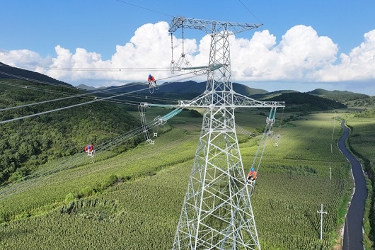 国网辽宁电力员工在铁岭—石岭500千伏线路工程对间隔棒消缺。