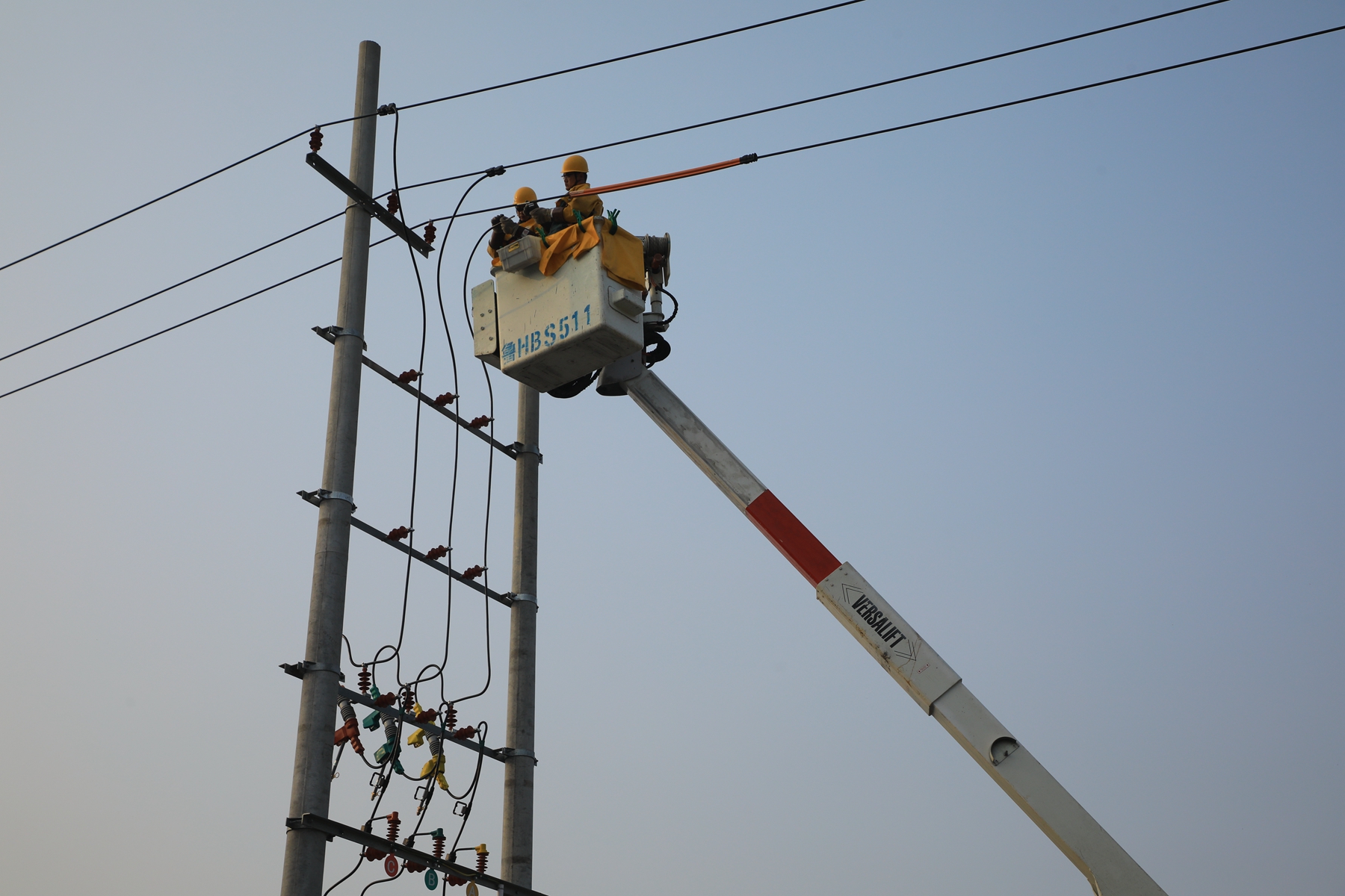 作业现场安全管控严密有序,作业流程规范高效。在工作负责人指挥下,作业人员身着全套绝缘装备登上绝缘斗臂车,缓缓靠近带电线路,严格按照操作规程依次完成验电、绝缘遮蔽、引线搭接等关键工序。地面监护人员全程紧盯作业流程,实时传递信息、把控安全风险。在高空与地面的默契协同、规范操作下,将小微企业新上100千伏安、200千伏安两台变压器顺利接入电网。
