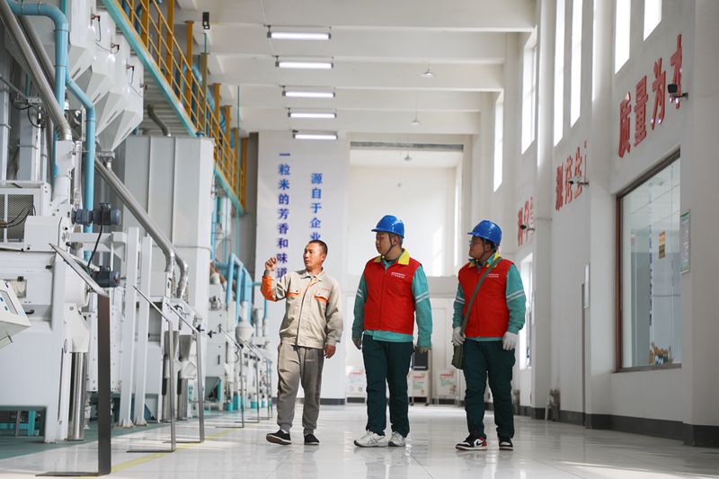 国网吉林舒兰市供电公司员工了解稻米生产车间用电情况。
