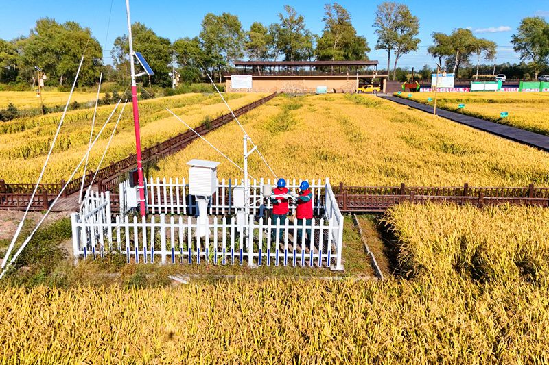 国网吉林松原供电公司员工在水稻基地检查农业监测终端设备。