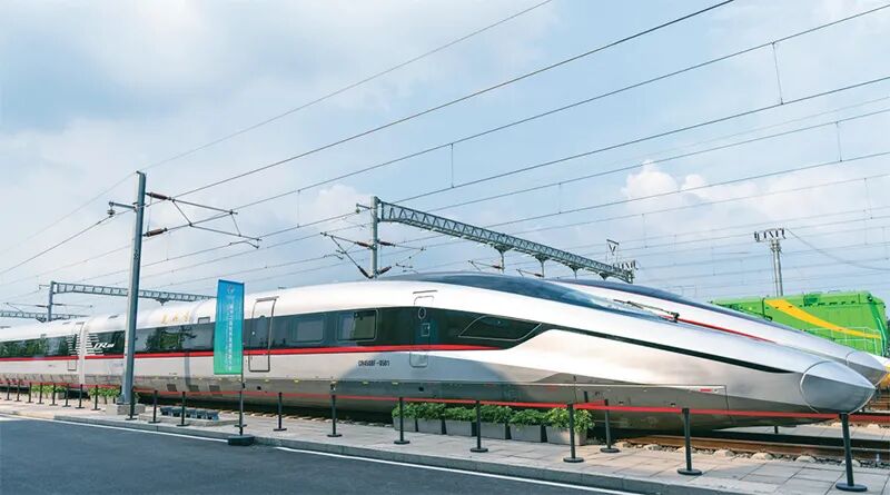“十四五”时期,以CR450动车组为代表的一项项重大技术装备项目取得新进展、实现新突破。CR450动车组试验速度可达450公里/小时,运营速度可达400公里/小时,是全球跑得最快的高铁。图为2025年7月9日,在国家铁道试验中心展区拍摄的CR450BF动车组。新华社记者才扬/摄