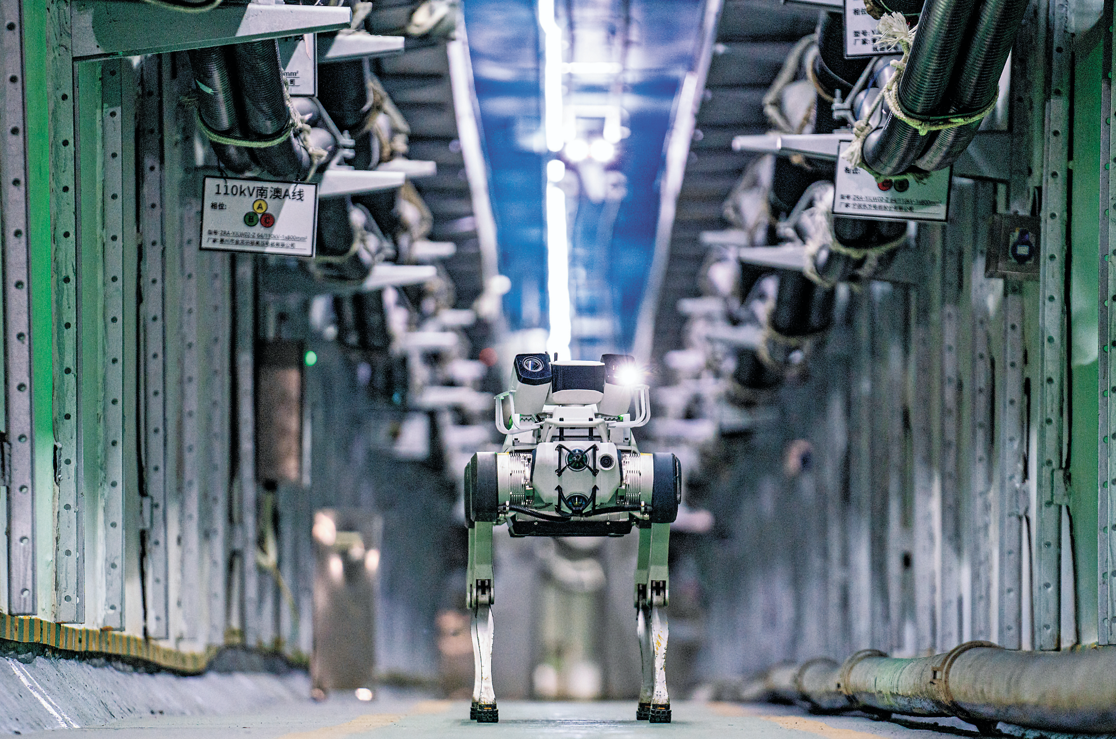 轨道机器人、“机器狗”四足巡检机器人在广东横琴综合管廊电力舱内开展对澳供电线路巡视。南方电网公司供图