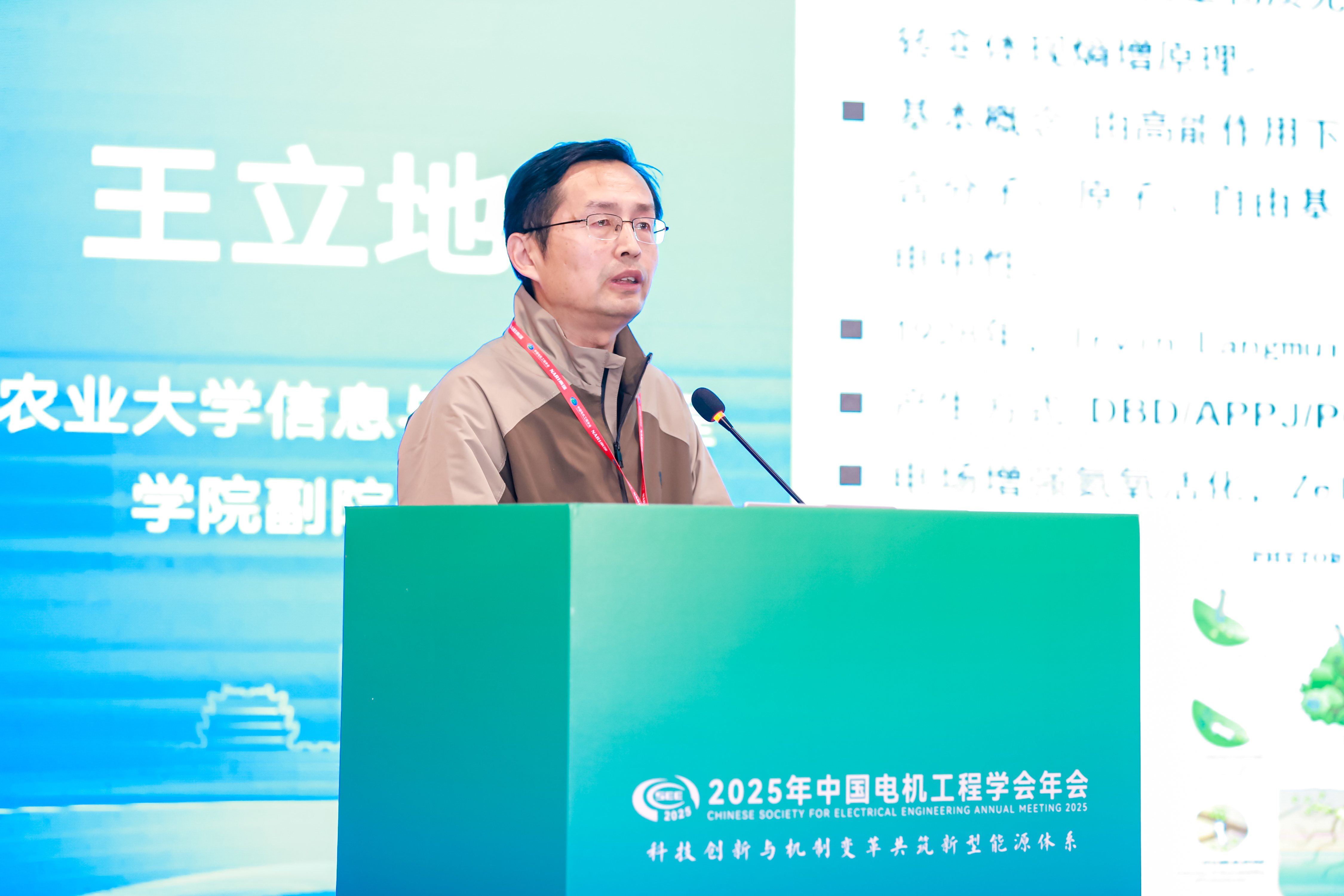 沈阳农业大学信息与电气工程学院副院长王立地作题为《光伏驱动等离子体技术及其在农业生产中的应用》的报告。报告重点讨论了光伏驱动等离子体这一交叉技术在现代农业中的研究应用现状及潜力。该技术可广泛应用于种子处理、水活化、病虫害防治及等离子体固氮等领域,尤其适合在偏远地区构建分布式、自给自足的绿色农业生产系统,是实现光伏电力有效消纳与推动农业高质量可持续发展的有效结合。