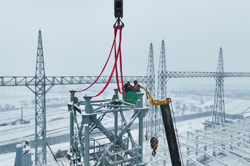 国网山西送变电公司施工人员在严寒天气下开展1000千伏构架吊装作业。