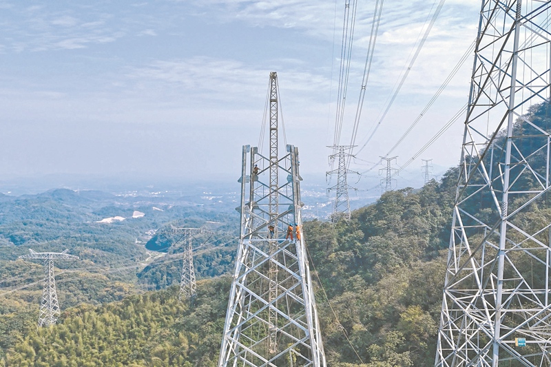 国网湖北电力员工开展500千伏蒲咸一二回线抗冰改造。