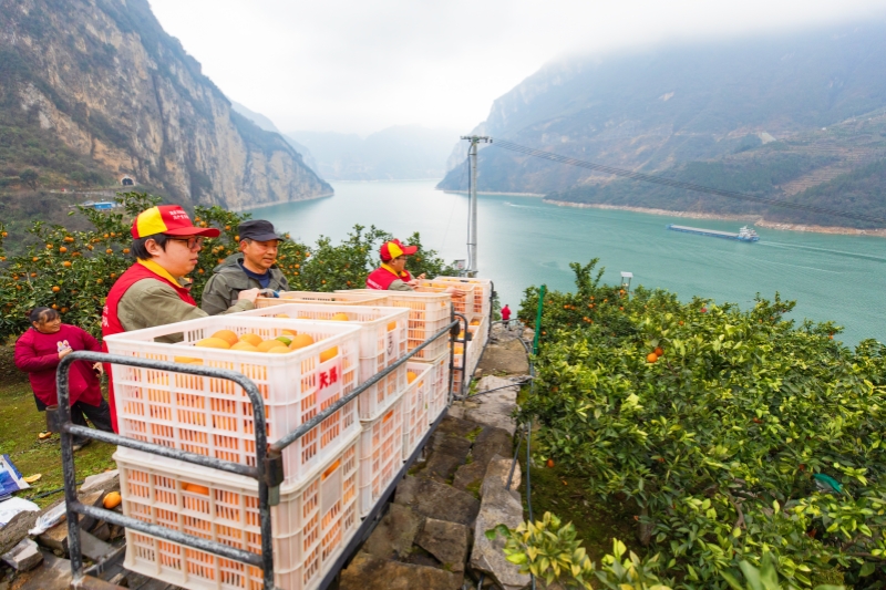 国网湖北秭归县供电公司员工利用电动运输车帮助种植户运送脐橙。
