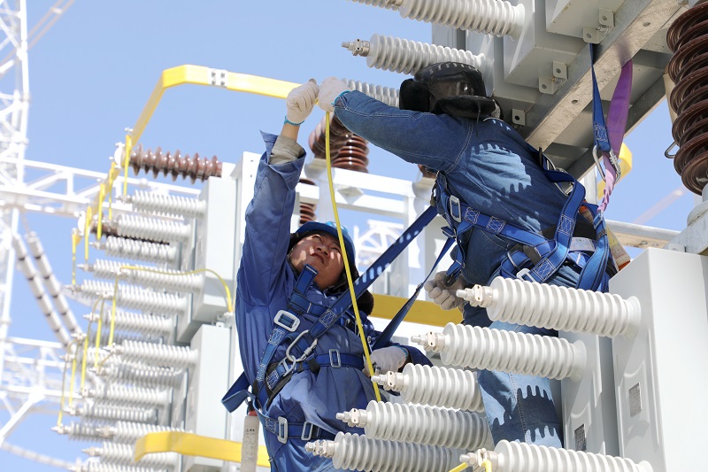 国网青海电力建设人员在红旗(塘格木)750千伏变电站开展电容器组接线工作。