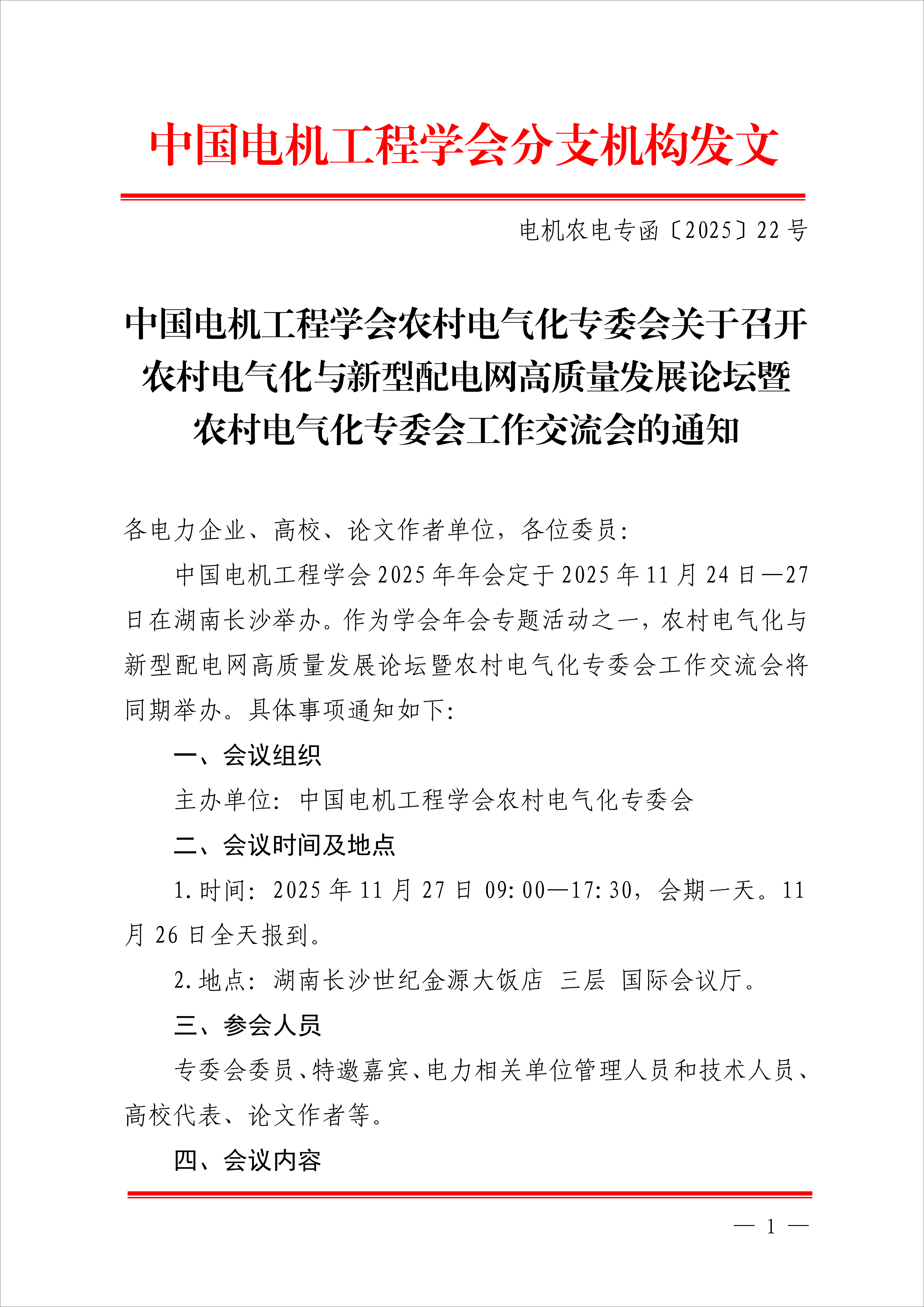 中国电机工程学会2025年年会定于2025年11月24日—27日在湖南长沙举办。作为学会年会专题活动之一,农村电气化与新型配电网高质量发展论坛暨农村电气化专委会工作交流会同期举办。