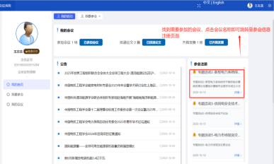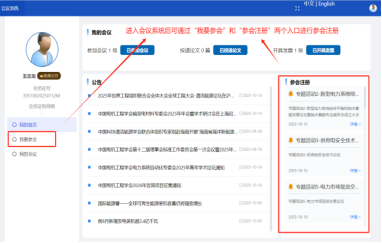 4.进入系统后,在右侧消息栏中选择对应的会议进入,第一步“我要参会”,第二步“参会注册”。