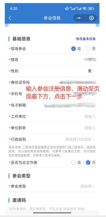 5.核对并填写会议注册信息点击下一步(参会类型为必选项,发票信息选择“是”即可进行填写发票信息)。