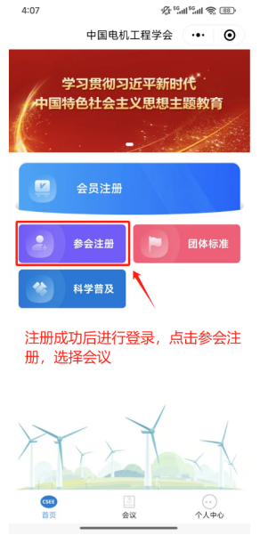 2.第1步,点击“个人中心”进行登录;如果没有学会账号,则进入第2步,在登录页面右下角点击“立即注册”,完成注册步骤,如有学会会员账号请在登录成功后直接前往第3步,点击“参会注册”;在学术会议栏目下找到本次会议的名称,第4步点击“我要参会”。