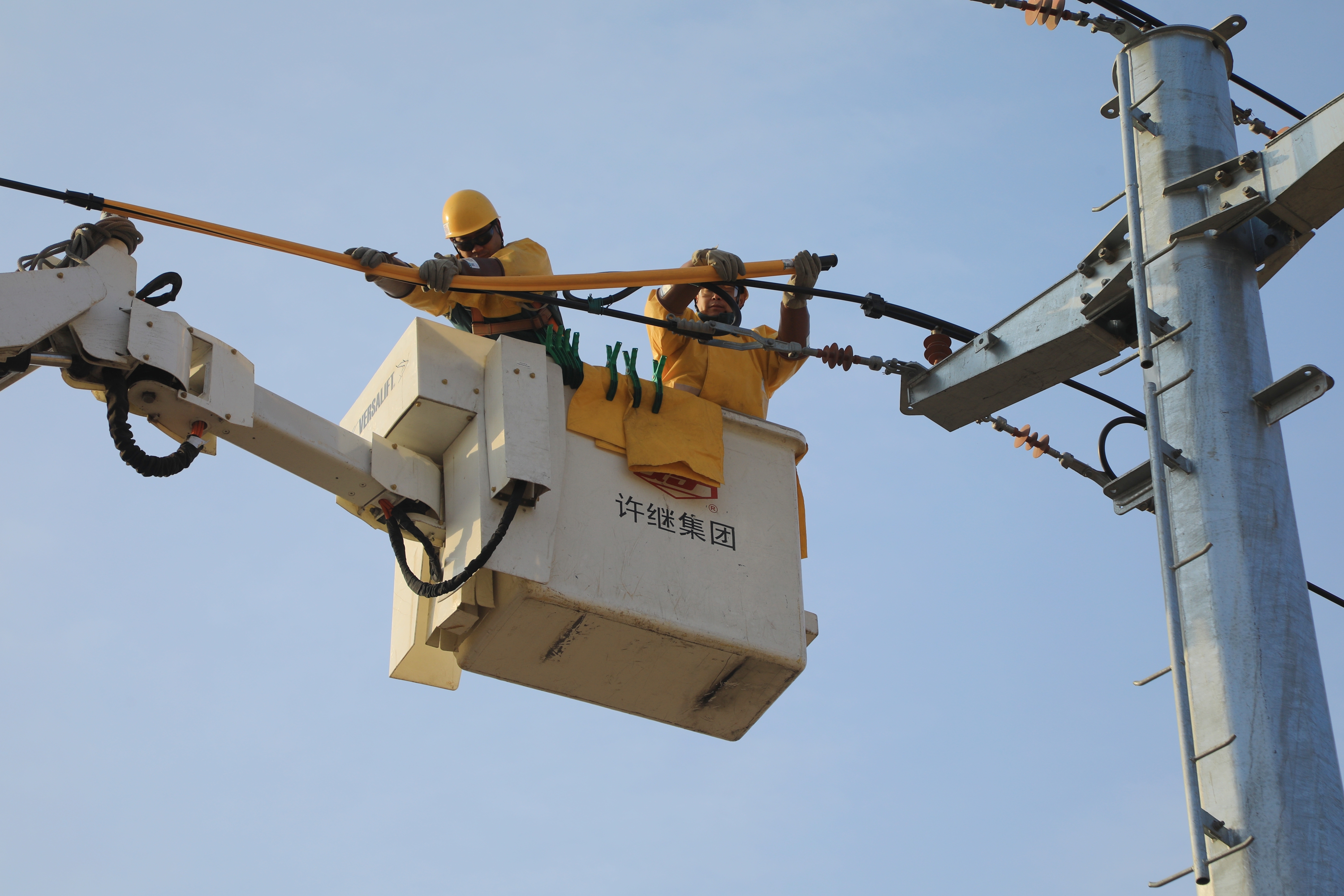当天上午8时许,该公司带电作业人员驱车携带全套专业工器具到达10千伏徐桥Ⅰ线12号杆处,工作负责人严格履行工作许可手续后,组织召开现场班前会,详细交代工作任务、安全措施、技术要点及危险点预控措施,确保每位作业人员心中有数。在确保各项安全措施到位后,两名经验丰富的带电作业人员穿上密不透风的黄色绝缘披肩,系好安全带,戴上绝缘手套和安全帽,带着专用操作工具,稳步登上绝缘斗臂车。