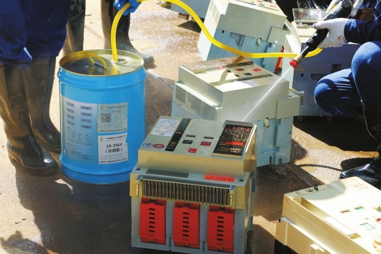 8月7日,佛山供电局抢修复电支援人员在东莞市黄江镇怡和花园用绝缘清洁剂冲洗配电柜。 陈珏璟 摄