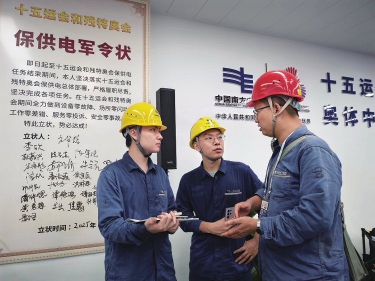 保电人员在十五运会开幕式奥体中心体育场电力保障现场联合指挥部商讨马道巡查计划。