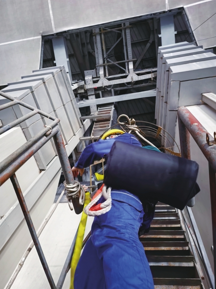 保电人员攀登角度近乎垂直的爬梯进入马道。