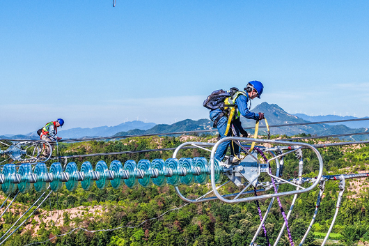江西送变电公司员工在赣州东500千伏输电线路开展高空验收。