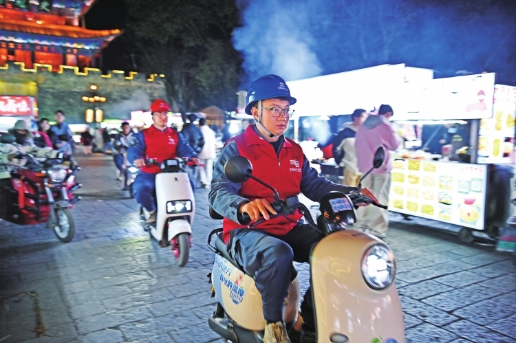 春节期间,党员突击队和服务队的队员们骑着“小电驴”穿梭于古城街巷。“在古城里,这是最便捷高效的交通工具。”李秋鹏说。