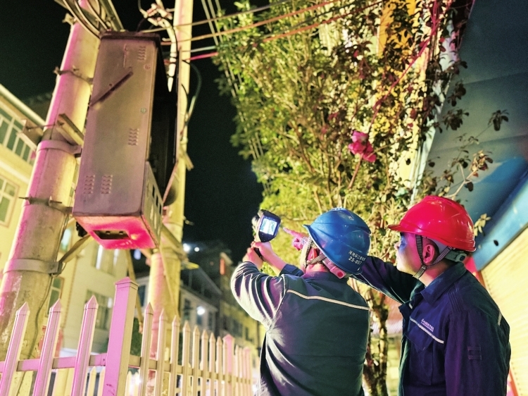 2月19日晚,广西电网公司河池环江供电局保供电人员对“返乡村”篮球比赛赛场周边供电线路和设备开展红外测温。 韦家会 摄