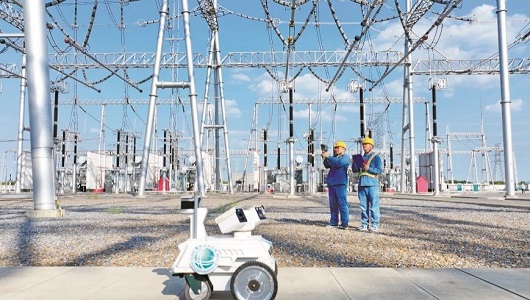 国网安徽电力员工运用智能巡检机器人巡检变电站主供电设备。